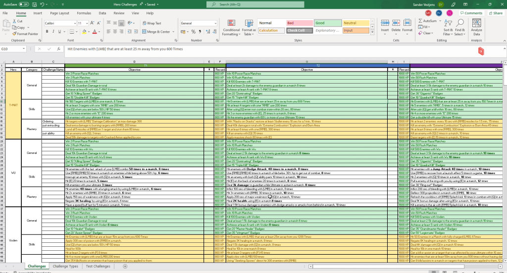 As part of the rebirth of Gigantic, we planned to add missions and challenges players could do to gain new cosmetics. In a collaborative meeting with the design team, we decided to split the challenges up into categories: