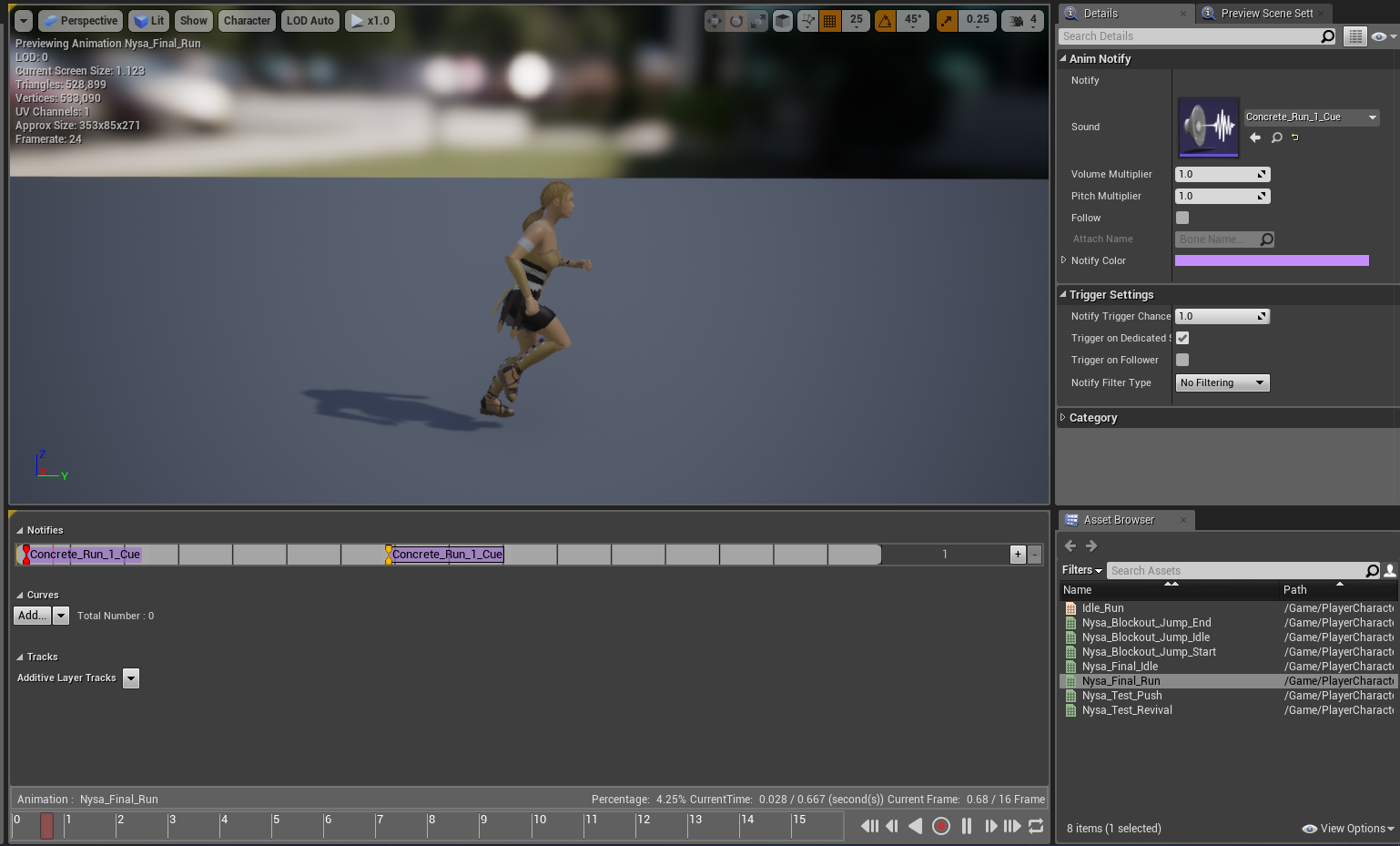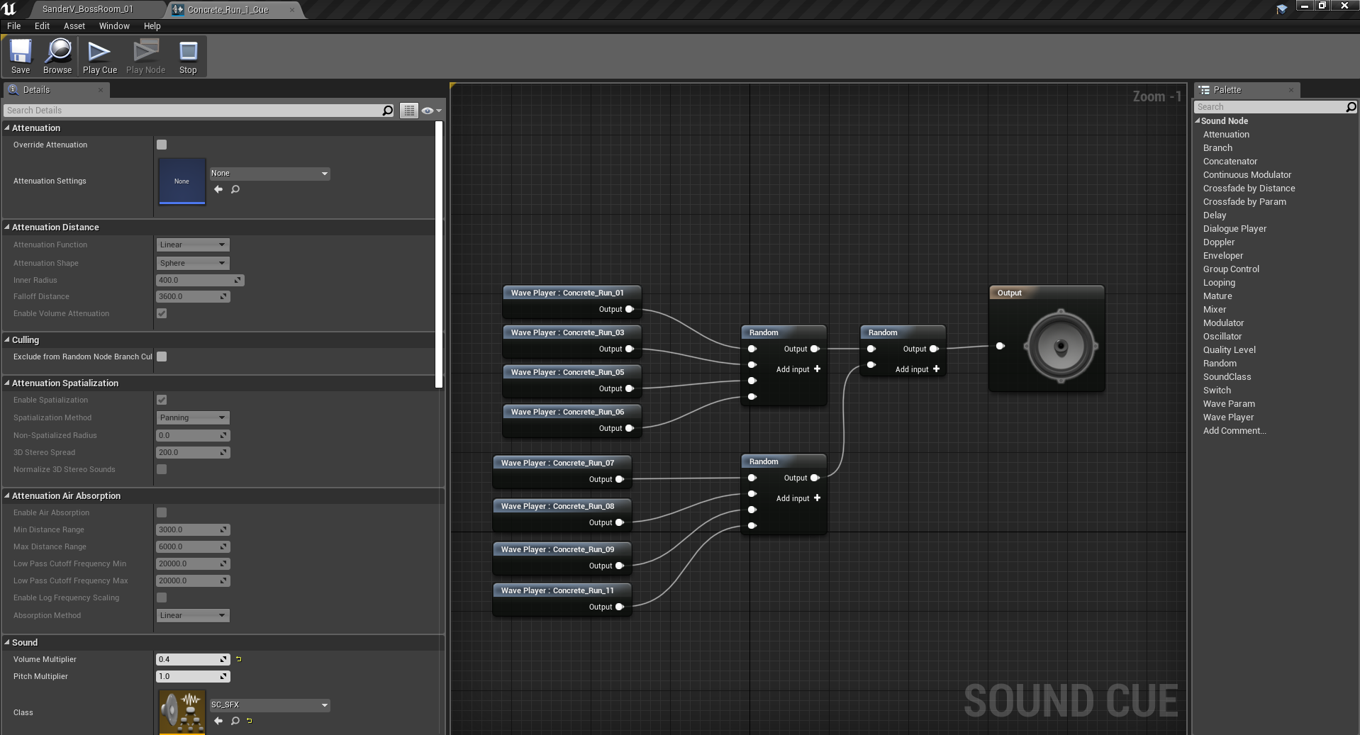 In the engine, I had created a Gym Level where I tested these sounds to see if they match with the game. I would later after some balancing, implement the sounds in the respective blueprints or even animation states.