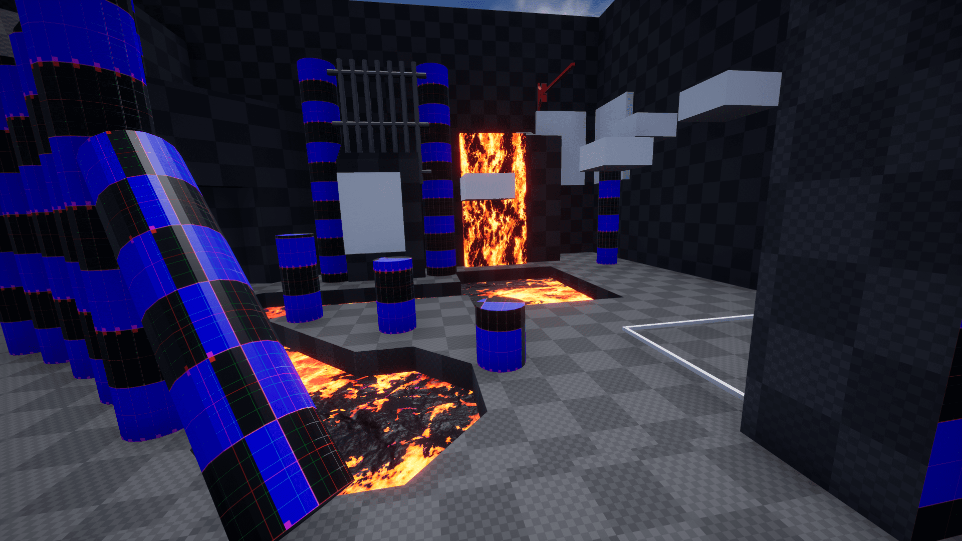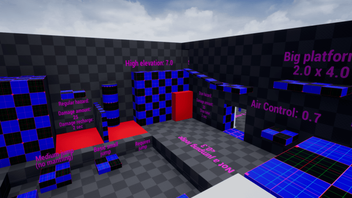 I created a gym level to test and establish the metrics I needed to start out with. It contained several obstacles and different shapes to see how characters handled these. Additionally I added in the gameplay features that got added to the game by game design. With these metrics, I was able to determine what the min, max, and comfortable variables were for jumps, hazard speeds, hazard knockback, etc.