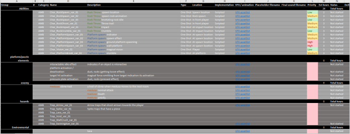 For Temple of Giants, I was responsible for both the level design of the boss room and the full audio of the game. to manage this process I had to come up with a good overview of all of the sounds that still needed work and were the most important. To do this I created the audio design document this document was extensive for all the purposes I needed.