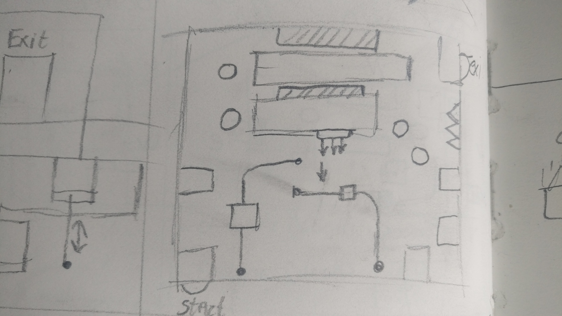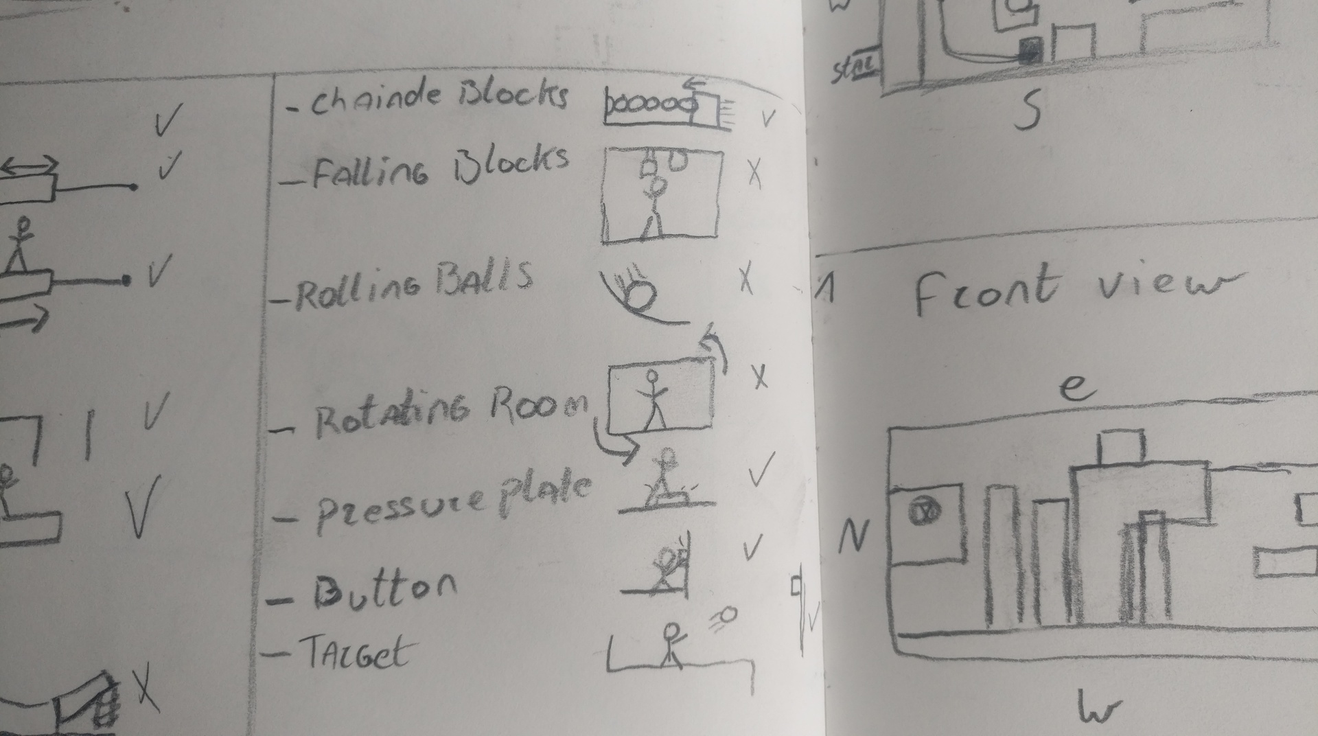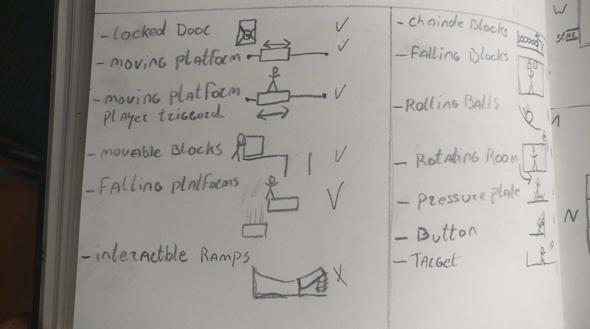 After creating a gym level to test out the basic metrics I need and seeing what features I could use. I started out by sketching moments that could think off. These moments were more platformer-based than puzzle-based at the time. This had to do with the team shifting the vision of the game a bit to more a platformer style with puzzle elements instead of the other way around.
