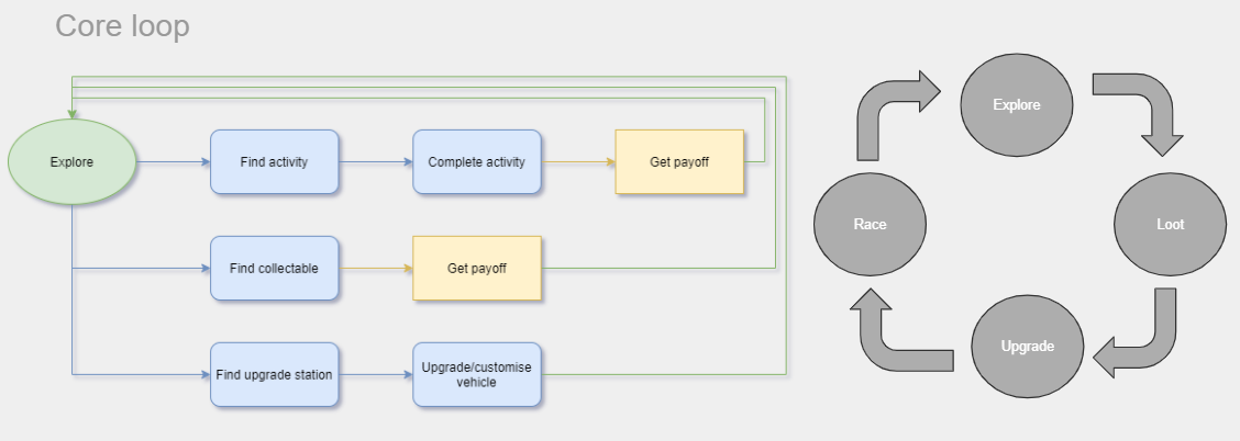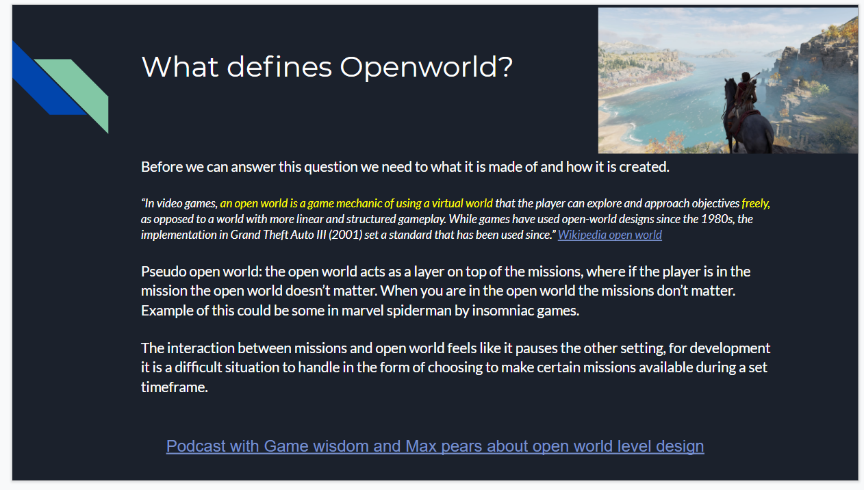 During the concepting teams, I took a look into reference games by analyzing Mad max for level design. I choose Mad Max since at this time it served as a great reference game due to having everything for our concept. It includes the required criteria of Quests/Missions, Objectives & scripted events, while also containing the customization and rebel/territorial influence gain.