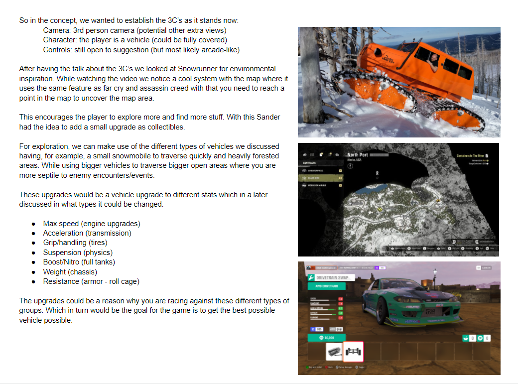 Once everyone had done their basic research into the criteria we started to diverge ideas of mechanics we could add to this game to create interesting and enjoyable gameplay. 1 of the main things I suggested was customization since this is a feature that is present in a lot of our reference games. Due to the sheer amount of ideas, the leadership team decided to split the team up into 4 smaller concept teams wherein we could delve deeper into a concept and work that out.